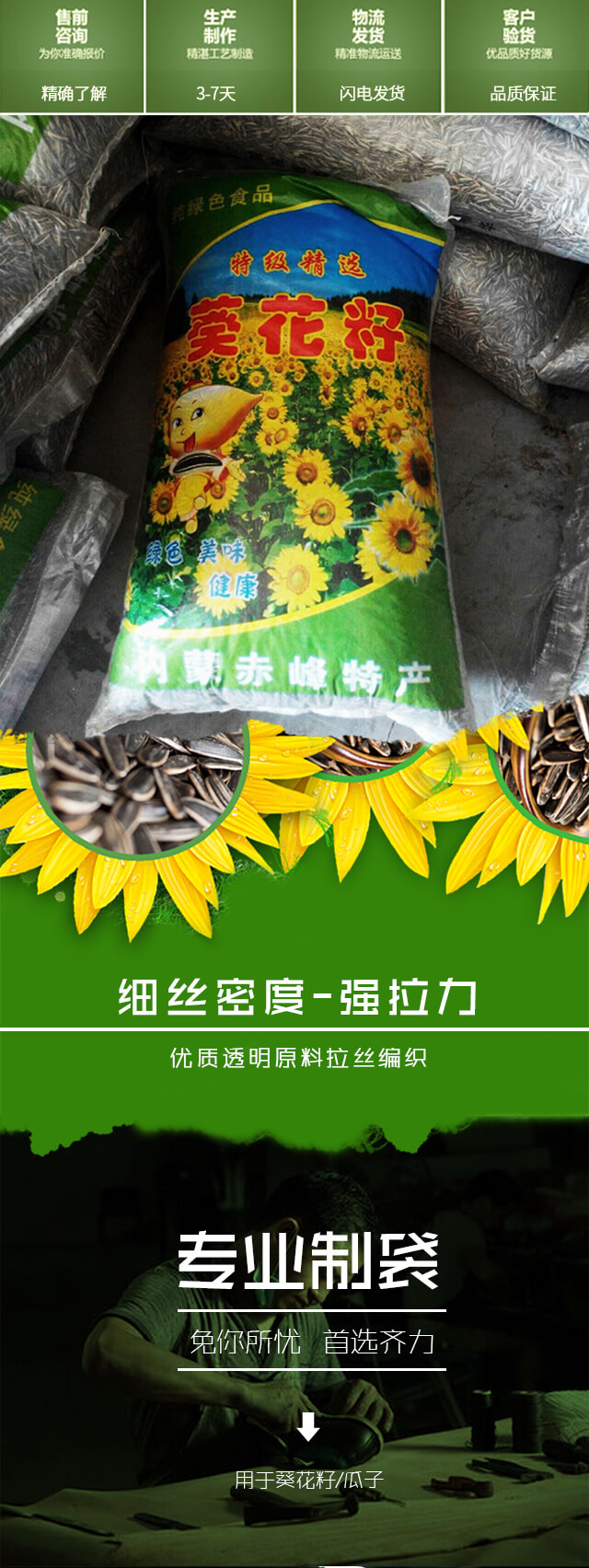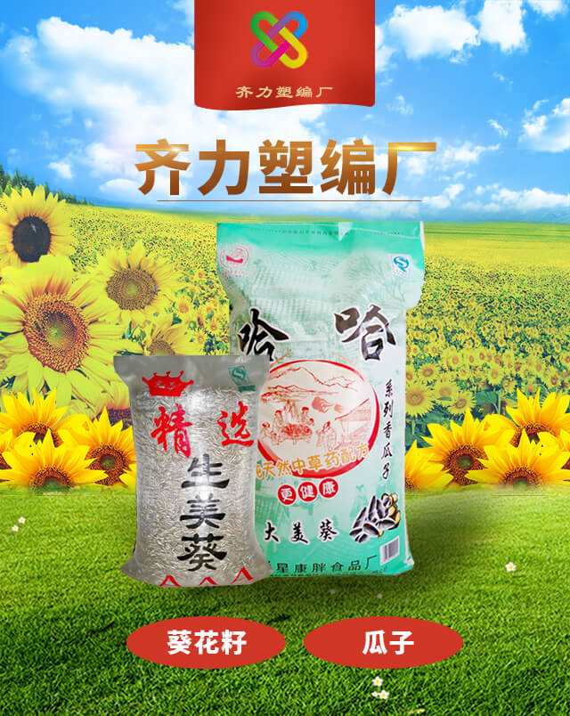 这里的瓜子袋是彩印编织袋,非食品级,可以装40斤-60斤瓜子,支持定制。